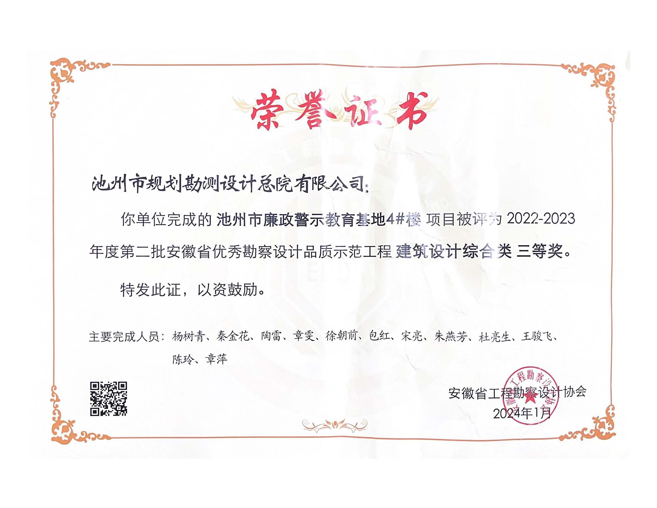 近日,2022-2023年度第二批安徽省優(yōu)秀勘察設(shè)計(jì)品質(zhì)示范工程名單公布,池州市規(guī)劃勘測(cè)設(shè)計(jì)總院有限公司憑借“池州市廉政警示教育基地4#樓設(shè)計(jì)項(xiàng)目”榮獲建筑設(shè)計(jì)綜合類三等獎(jiǎng)。