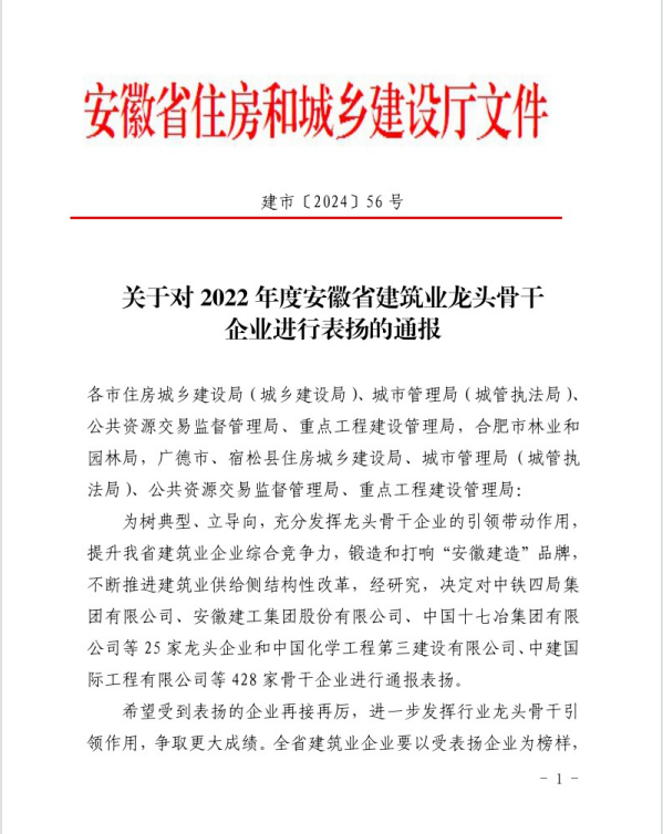 設(shè)計(jì)總院獲“安徽省建筑業(yè)龍頭骨干企業(yè)”稱號