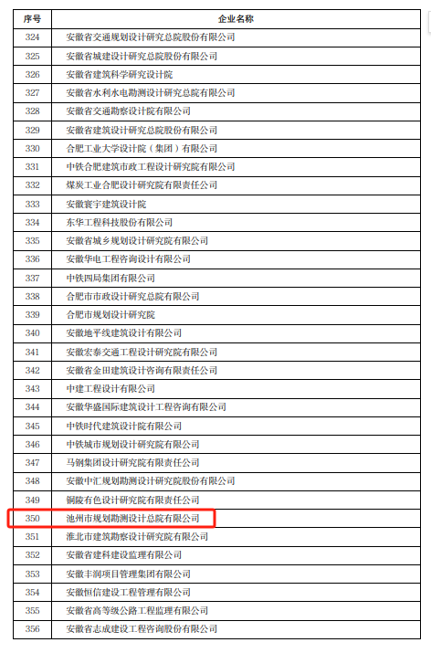 4月10日,安徽省住房和城鄉(xiāng)建設(shè)廳發(fā)布了《關(guān)于對2022年度安徽省建筑業(yè)龍頭骨干企業(yè)進(jìn)行表揚(yáng)的通報(bào)》,集團(tuán)所屬池州市規(guī)劃勘測設(shè)計(jì)總院有限公司榮登榜單。
